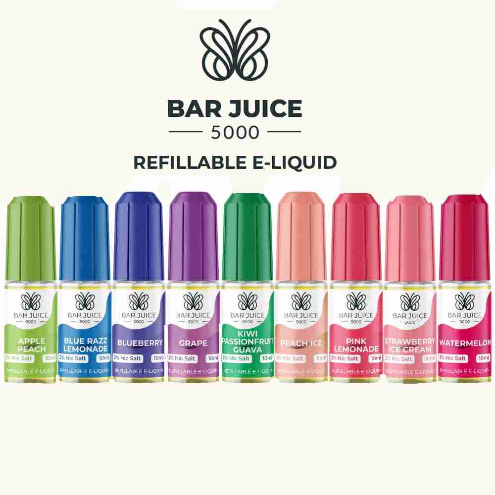 Bar Juice 5000 Nic Salt E-Liquids are our best-selling range of salt nicotine made with the same flavours found in some of the world’s best-selling disposable vapes, including the Elf Bar! Now, vapers can enjoy their favourite disposable flavours in any low-powered device, including pod systems, vape pens, and most vape starter kits. These 10ml vape juices contain up to 5000 puffs’ worth of juice, making them more cost-effective than disposable vapes and more eco-friendly overall.